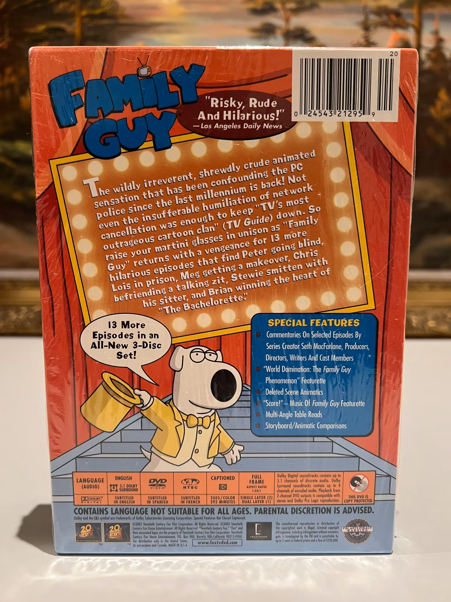 Följ med familjen Griffin och deras bisarra vardag i Quahog, Rhode Island. Denna volym (SÀsong 3) innehÄller fler av de politiskt inkorrekta skÀmten och de absurda musiknummer som gjort serien till en av de mest Àlskade vuxenanimationerna.