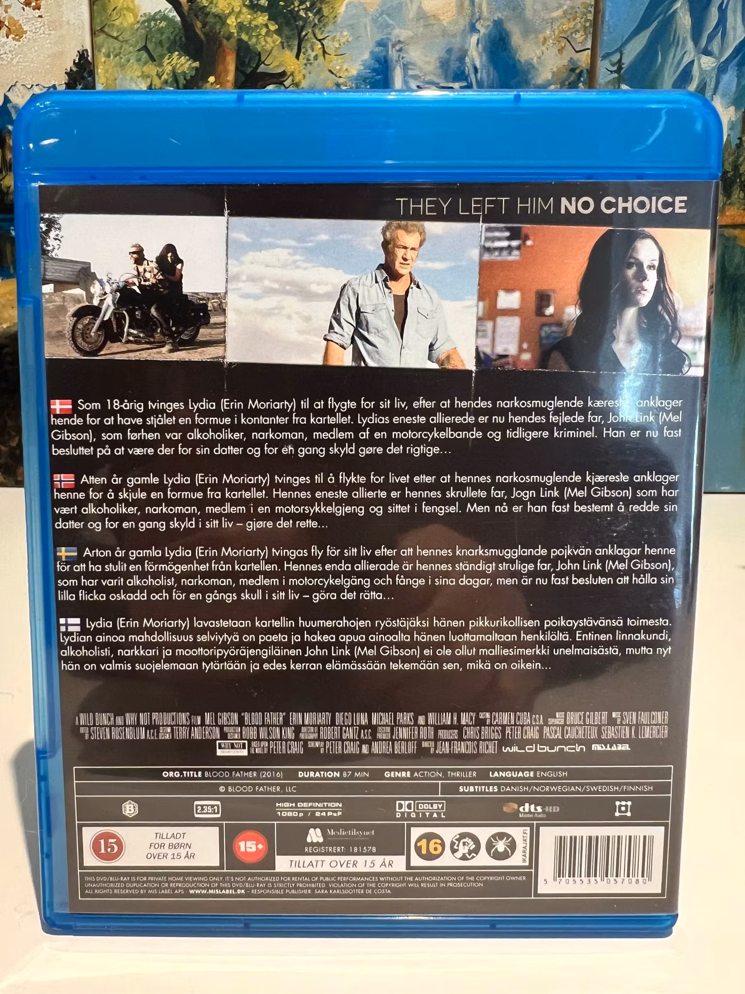 Blood Father Àr en intensiv och rÄ actionthriller med Mel Gibson i huvudrollen som John Link, en före detta alkoholist, narkoman och medlem i ett motorcykelgÀng. Link har lÀmnat sitt kriminella liv bakom sig, men tvingas ÄtervÀnda till sin mörka sida nÀr hans 18-Äriga dotter, Lydia (Erin Moriarty), dyker upp.