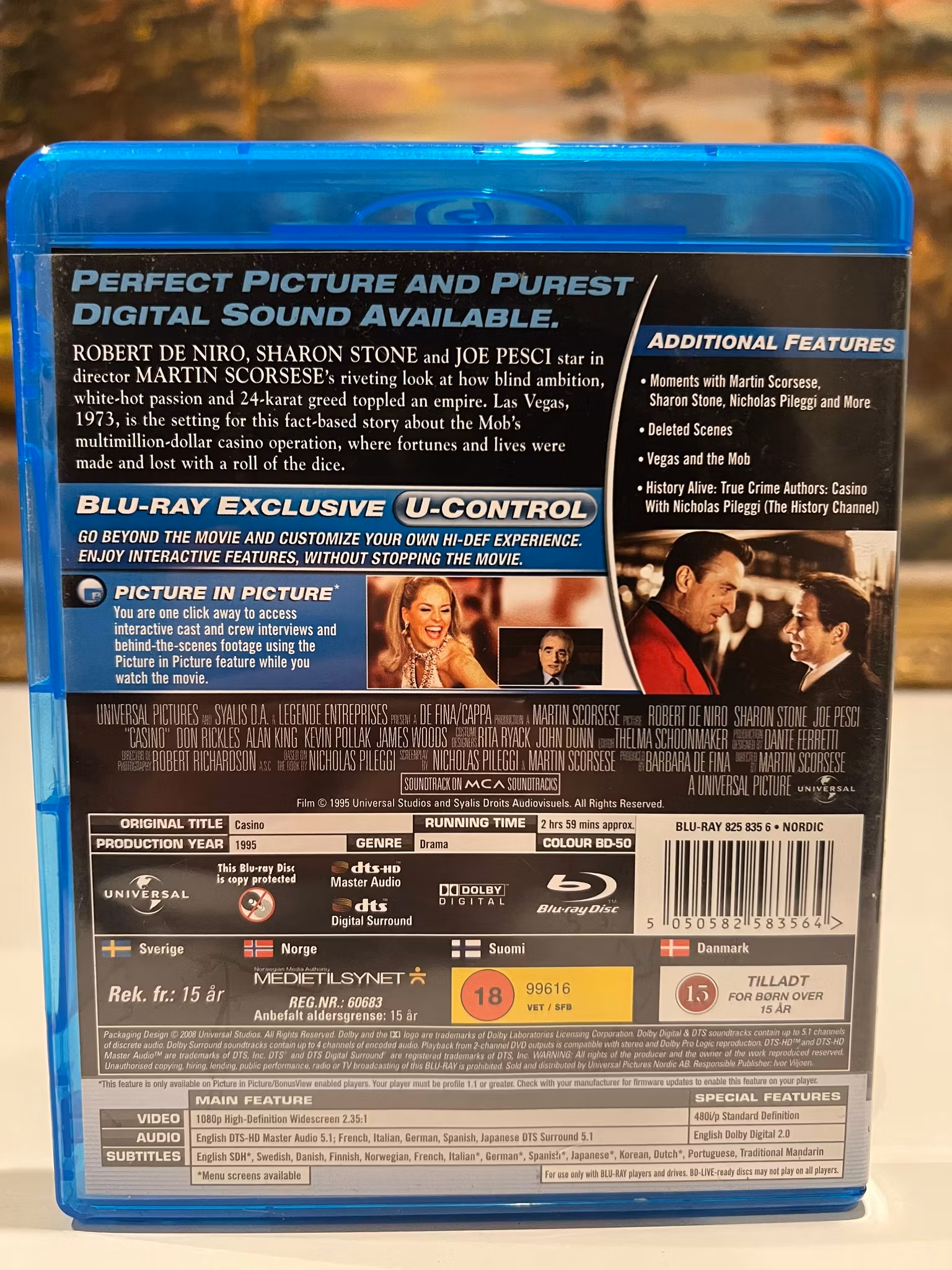 FrÄn mÀsterregissören Martin Scorsese kommer denna episka kriminalfilm baserad pÄ en sann historia. Filmen skildrar Sam "Ace" Rothstein (Robert De Niro), som av maffian skickas till Las Vegas för att driva ett kasino, och hans turbulenta relationer med hustrun Ginger (Sharon Stone) och hans barndomsvÀn Nicky Santoro (Joe Pesci).