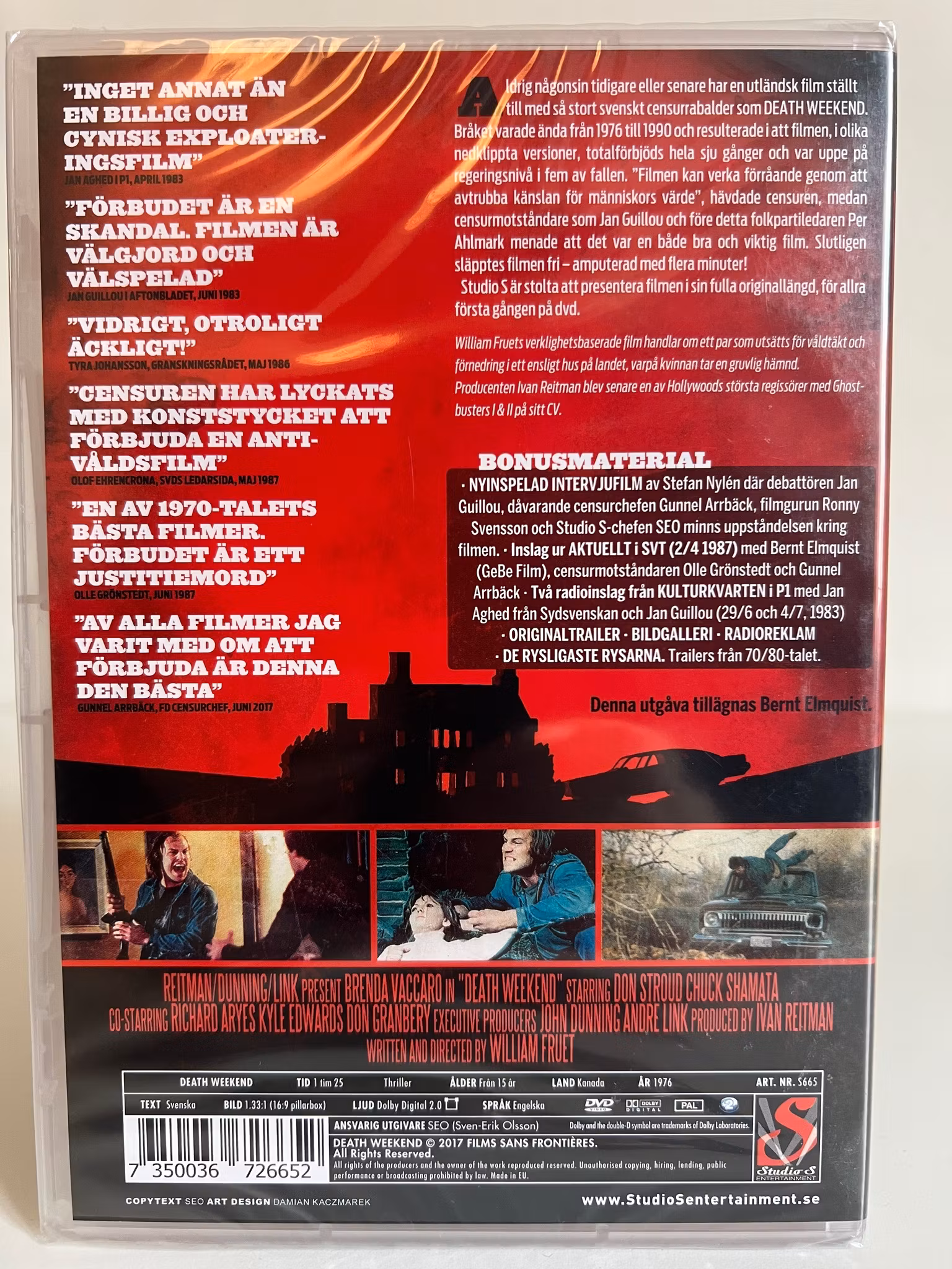 Aldrig någonsin tidigare eller senare har en utländsk film ställt till med så stort svenskt censurbulder som DEATH WEEKEND. Bråket varade ända från 1976 till 1990 och resulterade i att filmen, i olika nedklippta versioner, totalförbjöds hela sju gånger och var uppe på regeringsnivå i fem av fallen. Slutligen släpptes filmen fri – amputerad med flera minuter. Studio S är stolta att presentera filmen i sin fulla originallängd, för allra första gången på dvd.