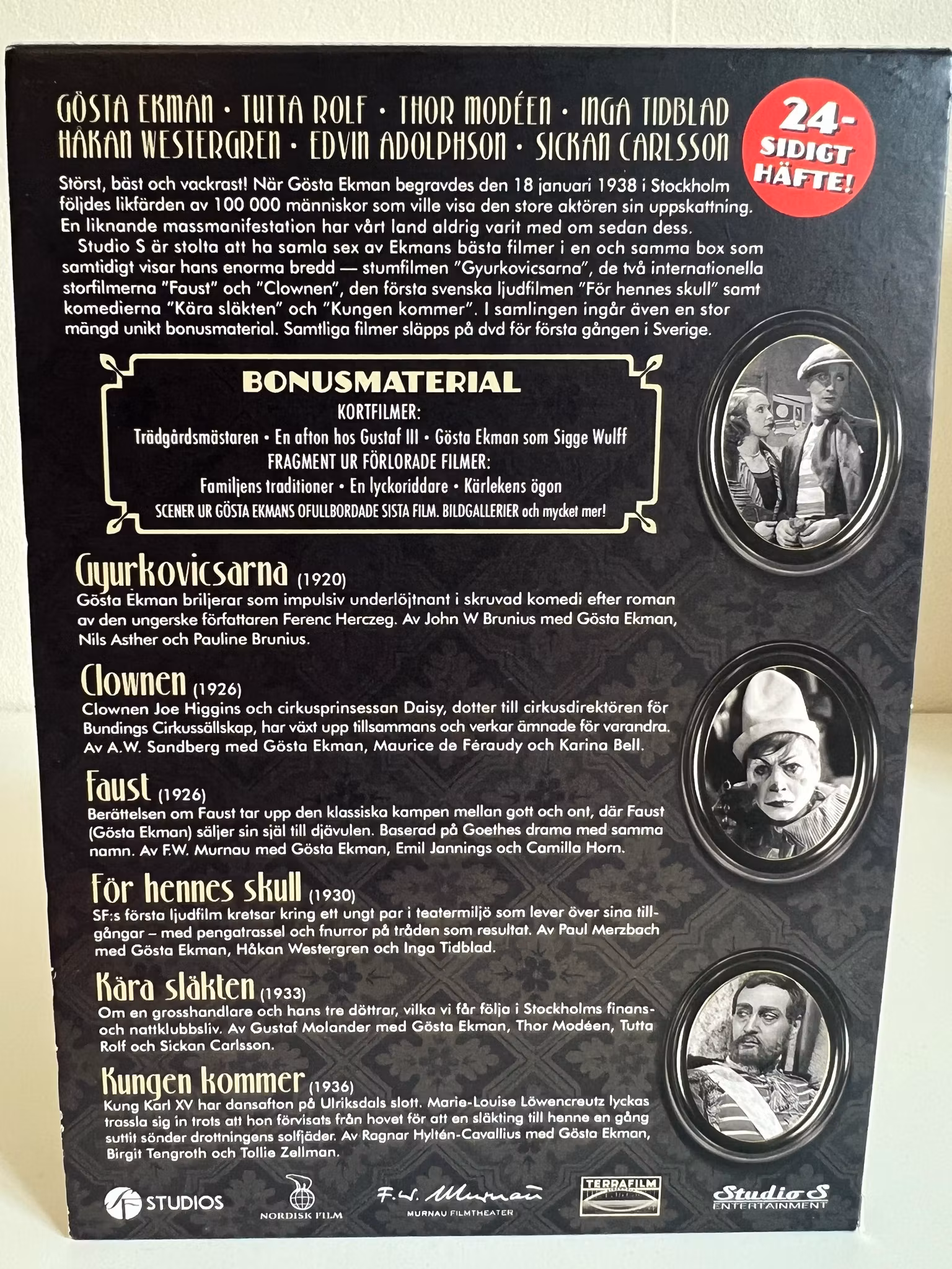 NÀr Gösta Ekman begravdes den 18 januari 1938 i Stockholm följdes likfÀrden av 100 000 mÀnniskor som ville visa den store aktören sin uppskattning. Studio S Àr stolta att samla sex av Ekmans bÀsta filmer i en och samma box, som visar hans enorma bredd. Samtliga filmer slÀpps pÄ DVD för första gÄngen i Sverige i och med denna utgÄva.