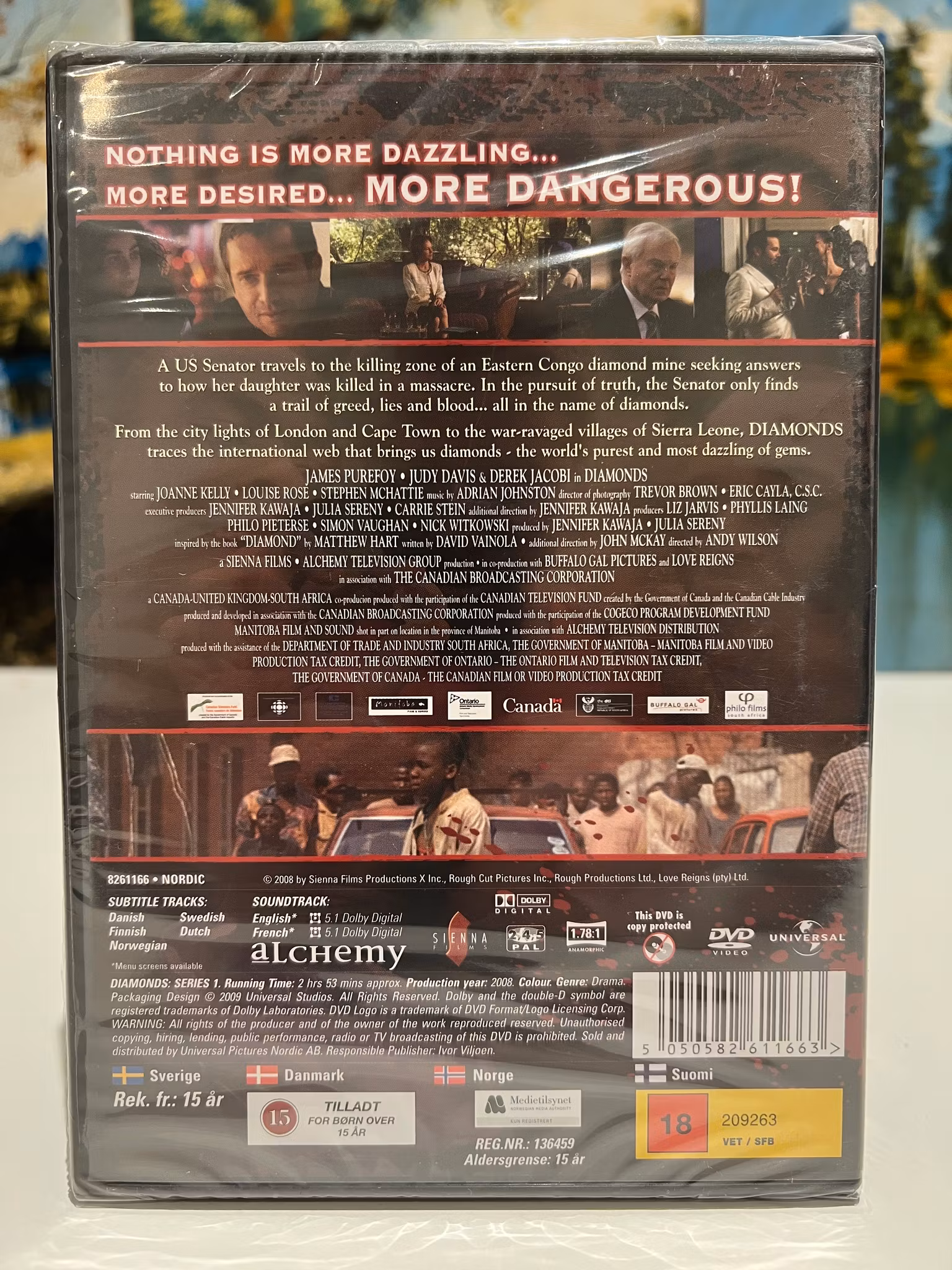 Denna miniserie spÄrar det internationella nÀtverk som förser vÀrlden med dess mest eftertraktade Àdelstenar, frÄn de krigshÀrjade byarna i Sierra Leone till styrelserummen i London och Kapstaden. I den starka rollistan ser vi Àven James Purefoy (Rome), Derek Jacobi (Gladiator) och Joanne Kelly.