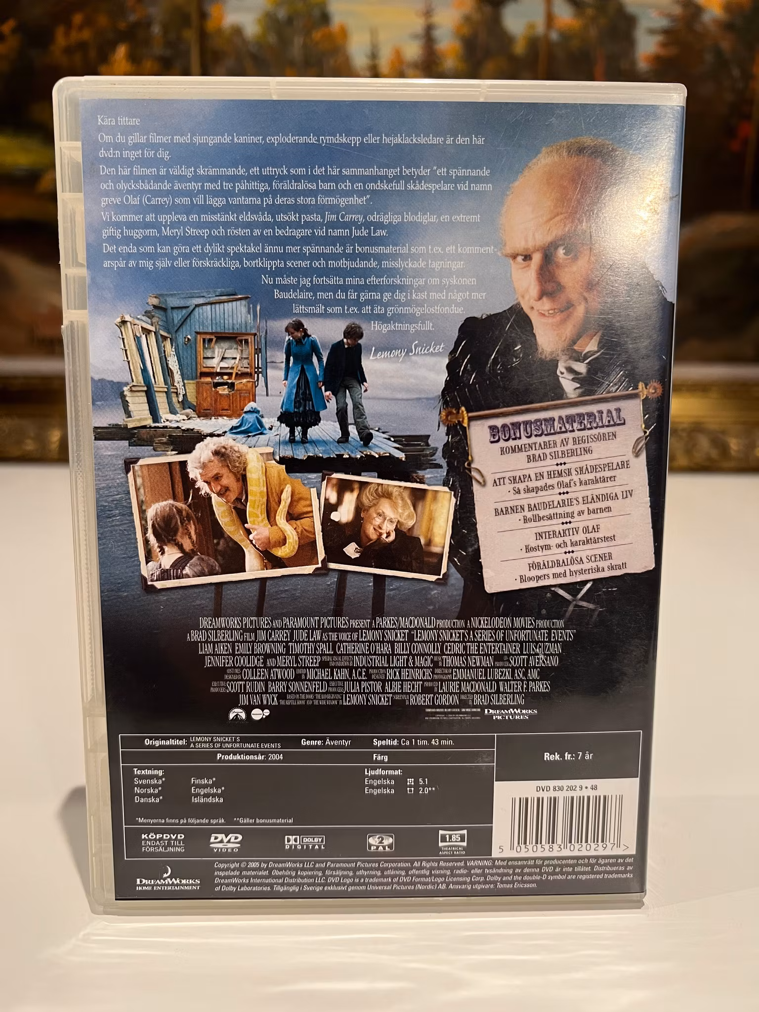Följ syskonen Violet, Klaus och Sunny Baudelaires efter att deras förÀldrar omkommit i en mystisk brand. De skickas till sin slÀkting, den ondskefulle Greve Olaf (Jim Carrey), som bara Àr ute efter deras Àrvda förmögenhet. En fantasifull, mörk och humoristisk Àventyrsfilm baserad pÄ Daniel Handlers bÀstsÀljande böcker.