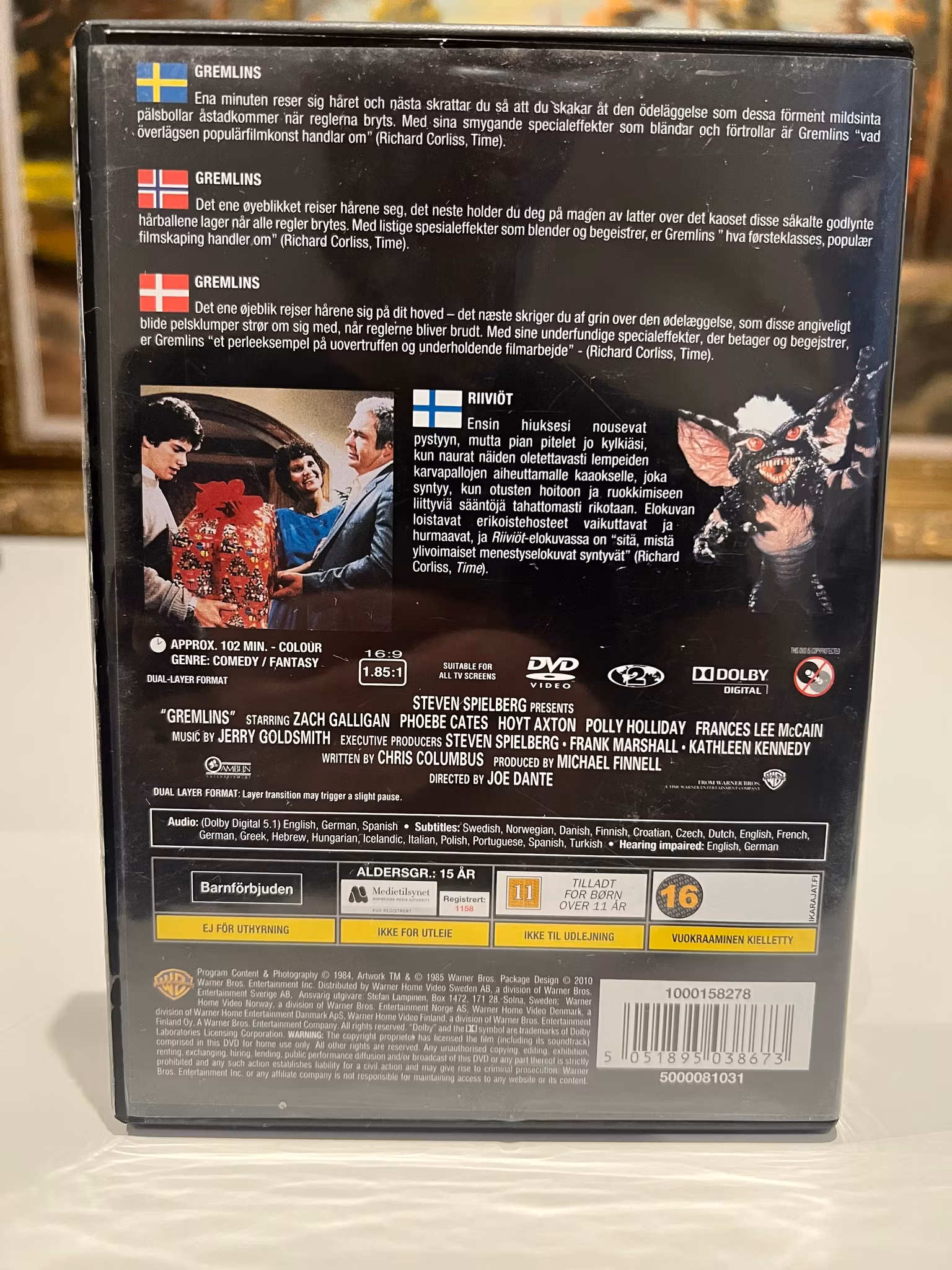 En kultklassiker producerad av Steven Spielberg! Den unge Billy fÄr en exotisk, mystisk varelse som husdjur (Gizmo) med tre strikta regler: 1) UtsÀtt den inte för starkt ljus, 2) Ge den aldrig vatten, 3) Mata den aldrig efter midnatt. NÀr reglerna bryts slÀpps en hord av onda, gröna Gremlins ut över staden