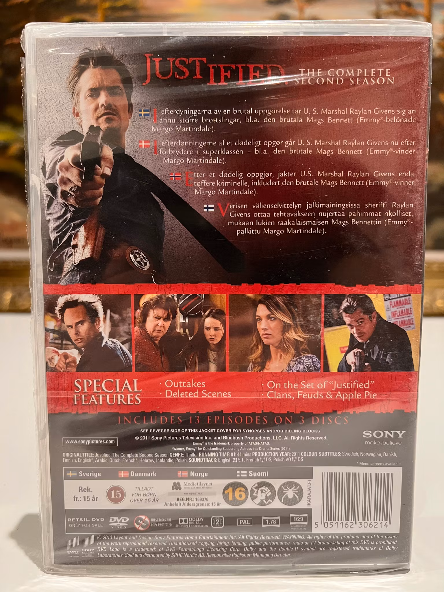 Denna hyllade andra sÀsong av Justified baserad pÄ Elmore Leonards noveller tar U.S. Marshal Raylan Givens (Timothy Olyphant) tillbaka till hans hemstat Kentucky. I den hÀr sÀsongen stÀlls han mot den farliga och inflytelserika familjen Bennett. Serien Àr en smart och stilfull Neo-Western med mycket action.