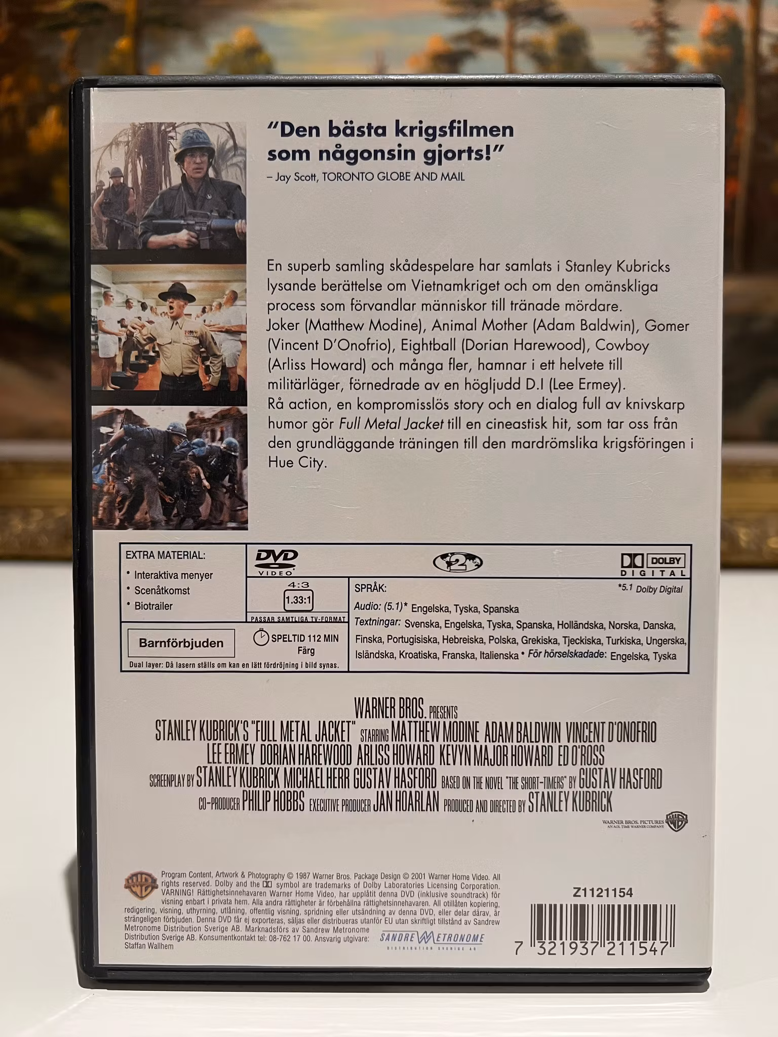 FrÄn mÀsterregissören Stanley Kubrick kommer denna intensiva och brutalt satiriska skildring av USA:s krig i Vietnam. Filmen Àr uppdelad i tvÄ delar, och följer rekryternas brutala trÀning och den psykologiska terrorn de möter pÄ slagfÀltet. Ett mÄste i varje filmkÀnnare samling.