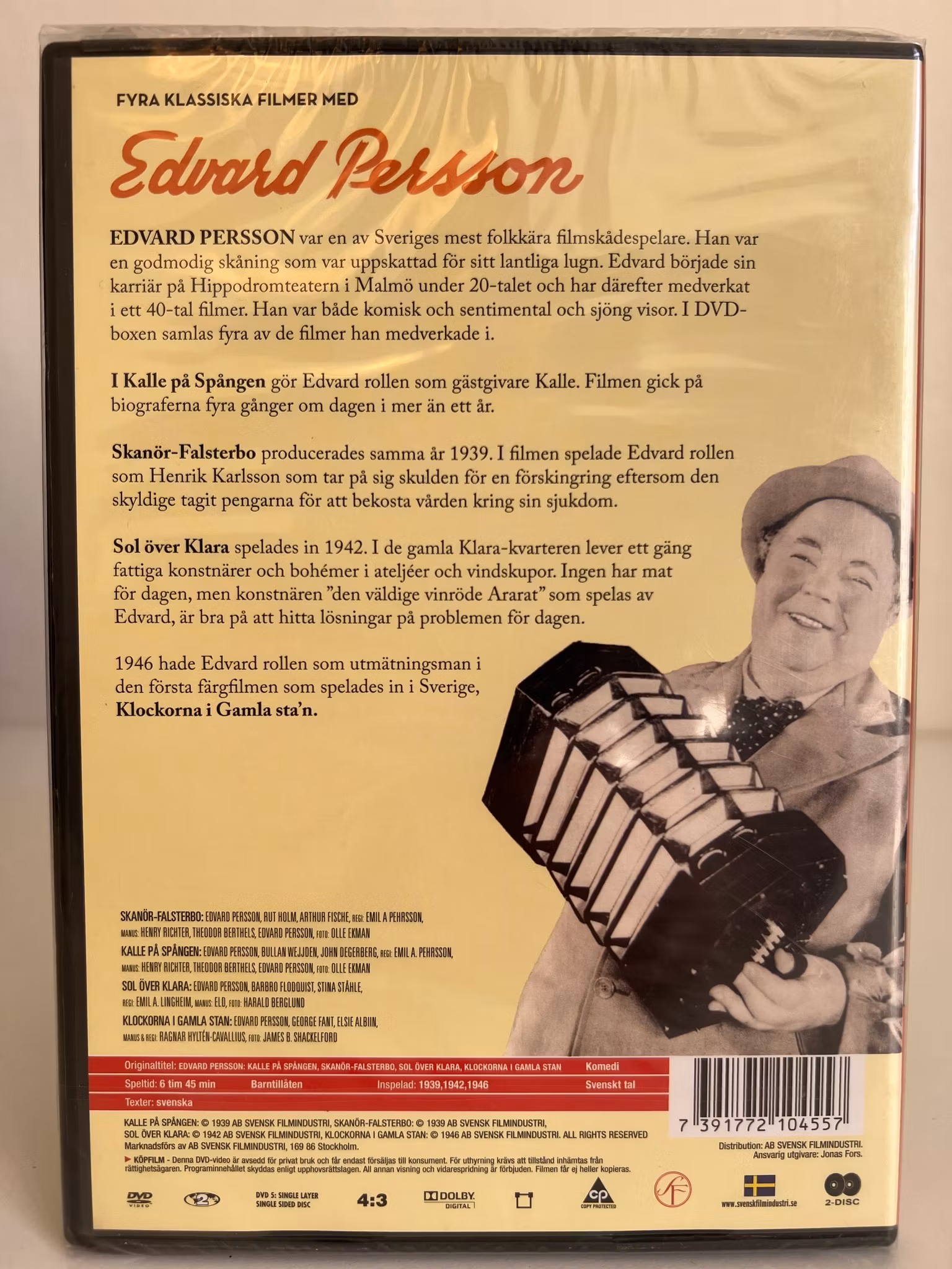 Edvard Persson var en av Sveriges mest folkkära filmskådespelare. Han var en godmodig skåning som var uppskattad för sitt lantliga lugn. Edvard började sin karriär på Hippodromteatern i Malmö under 20-talet och har därefter medverkat i ett 40-tal filmer. Han var både komisk och sentimental och sjöng visor som blivit odödliga klassiker.