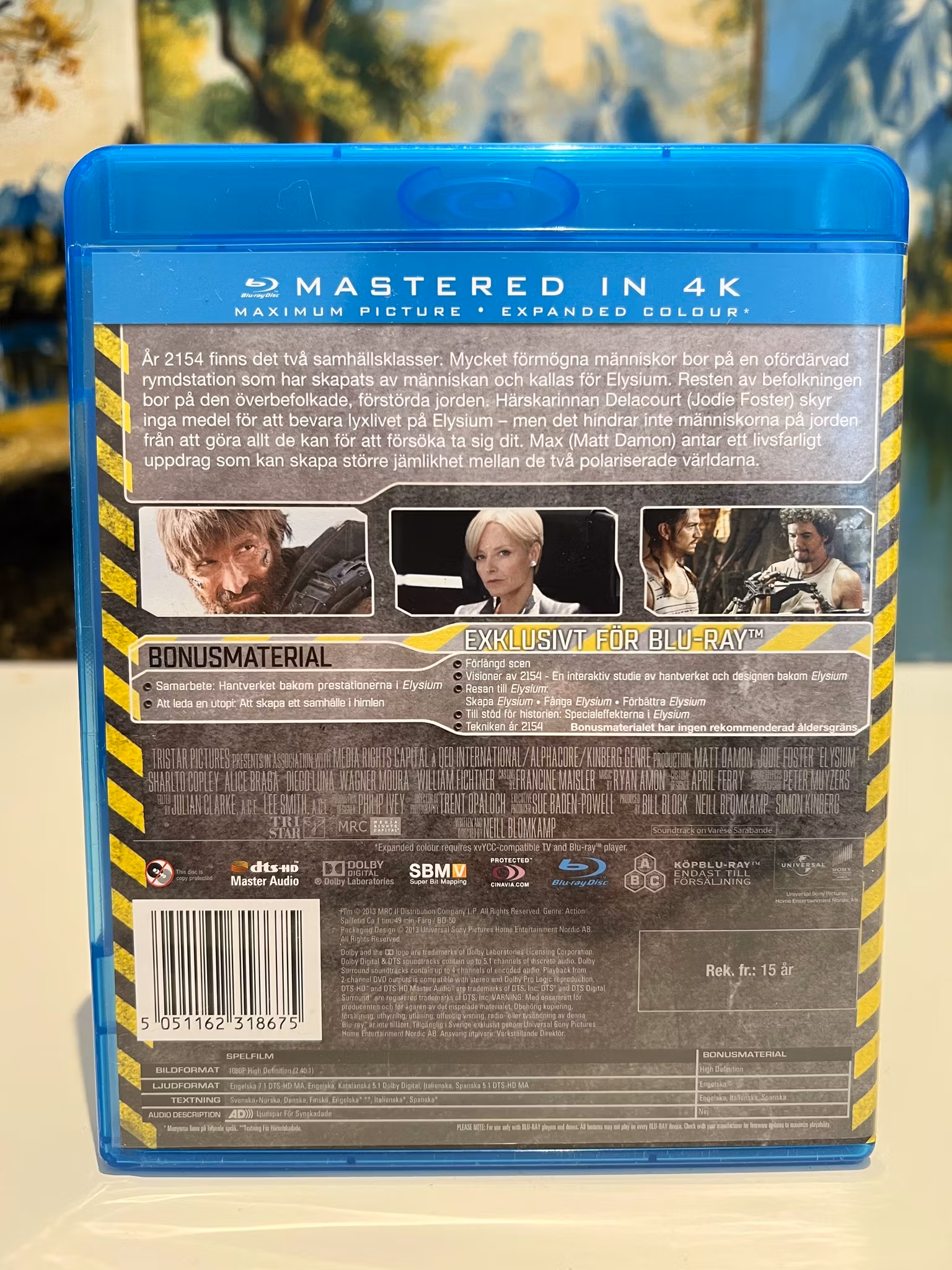 Exklusivt bonusmaterial för Blu-ray: Denna utgÄva Àr laddad med extramaterial som ger en djup inblick i filmens skapande. Utforska dokumentÀrer som "Samarbete: Hantverket bakom prestationerna i Elysium" och "Visoner av 2154", en interaktiv studie av designen bakom filmen. Du fÄr Àven följa med pÄ "Resan till Elysium" dÀr skapandet, infÄngandet och förbÀttrandet av Elysium skildras, samt fördjupa dig i tekniken och specialeffekterna Är 2154. InnehÄller Àven en förlÀngd scen.