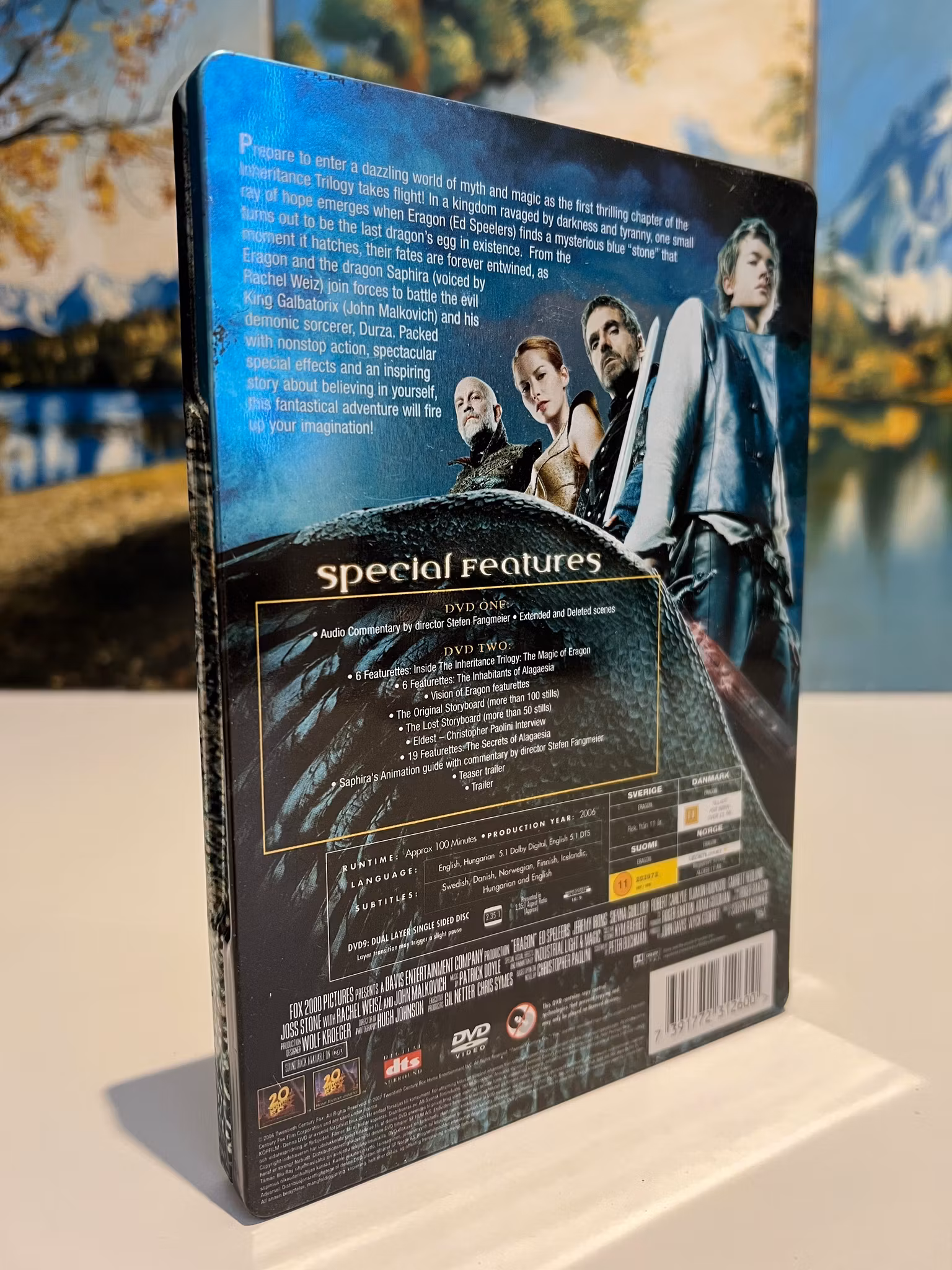 Tillsammans med sin drake Saphira och mentorn Brom (Jeremy Irons) kastas han in i en vÀrld av magi och maktkamp för att störta den onda kungen Galbatorix. Denna utgÄva Àr en 2-Disc Special Edition i en snygg Steelbook (plÄtbox).