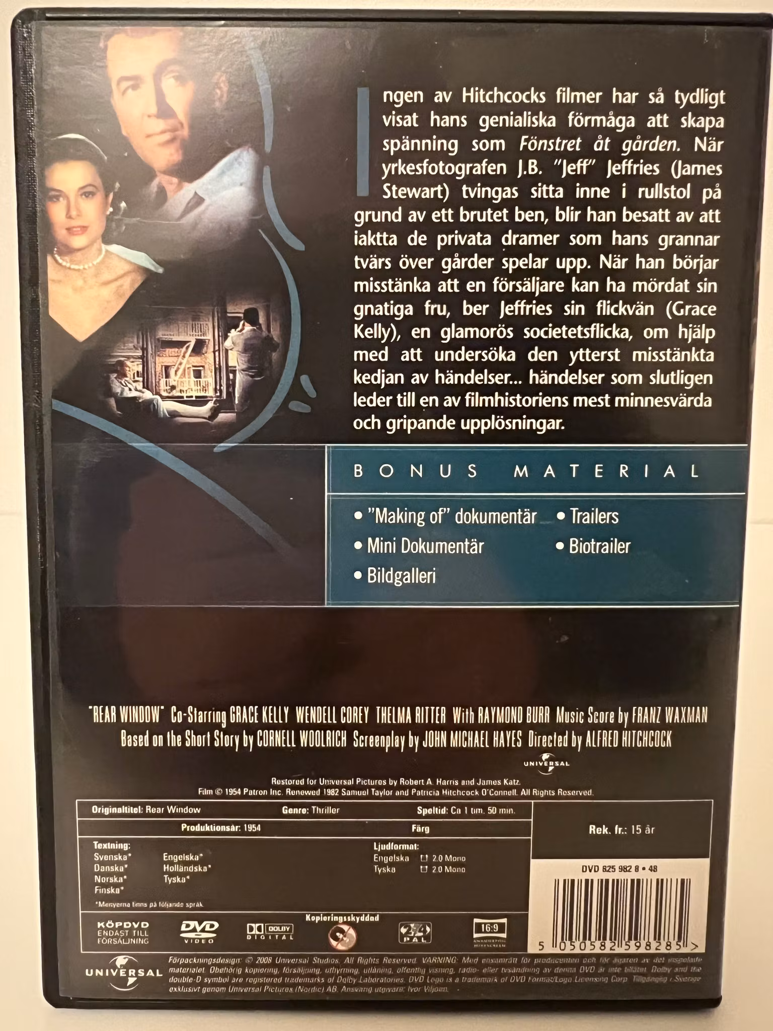 När yrkesfotografen J.B. ”Jeff” Jeffries (James Stewart) tvingas sitta inne i rullstol på grund av ett brutet ben, blir han besatt av att iaktta de privata dramer som hans grannar tvärs över gården spelar upp.