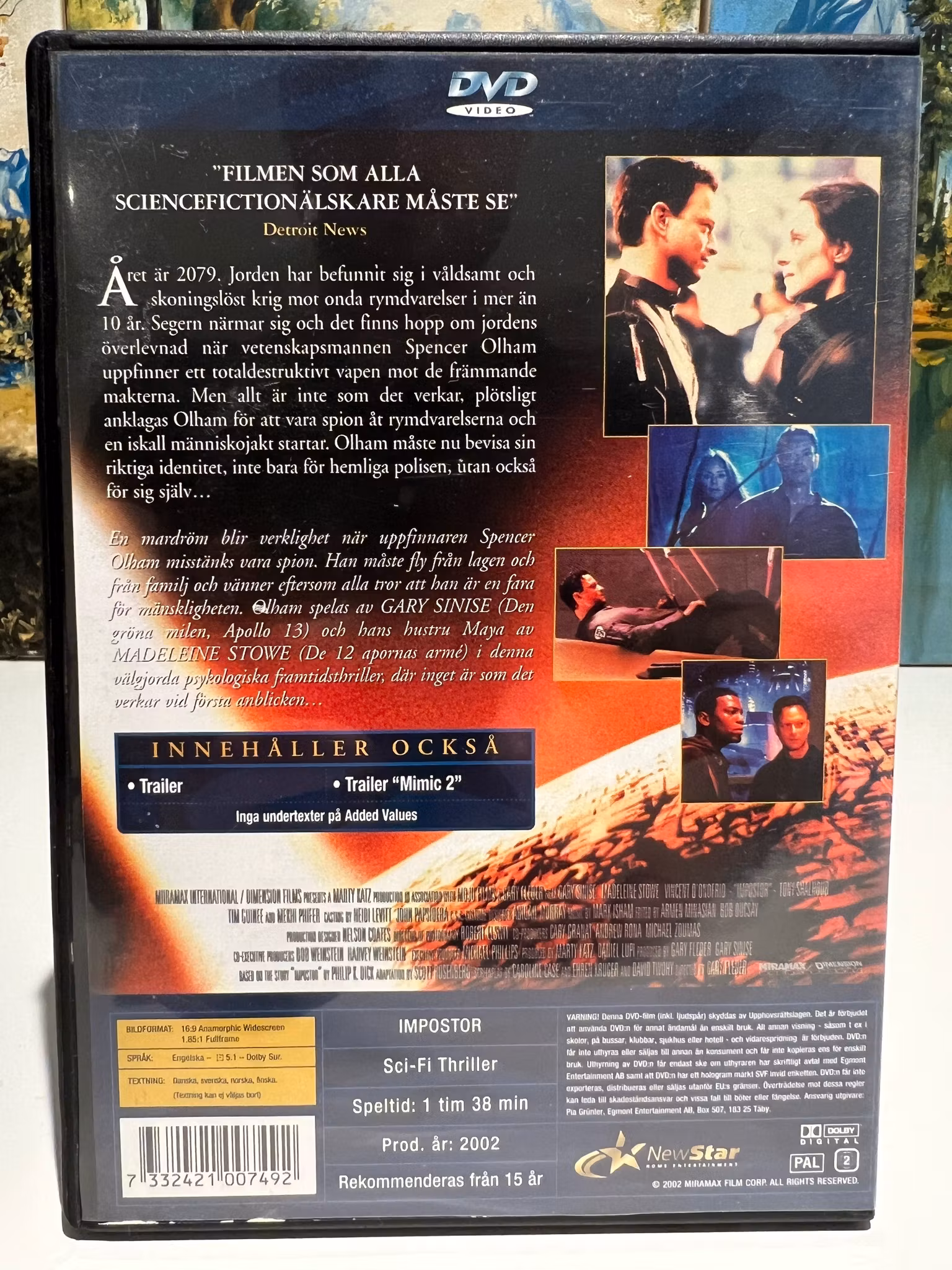 Impostor Àr en vÀljord psykologisk framtidsthriller baserad pÄ en novell av Philip K. Dick (Blade Runner, Total Recall). I rollerna ser vi Àven Madeleine Stowe och Vincent D'Onofrio.