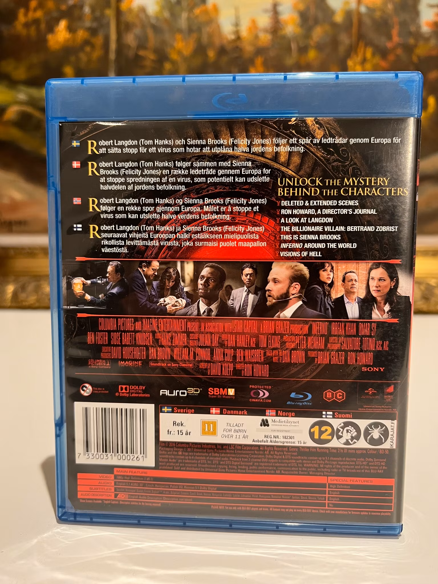 Professor Robert Langdon (Tom Hanks) vaknar upp pÄ ett sjukhus i Italien med minnesförlust och tvingas följa ett spÄr av ledtrÄdar som leder genom Europa. Han slÄr sig samman med lÀkaren Sienna Brooks (Felicity Jones) för att sÀtta stopp för en virusattack som hotar att utplÄna halva jordens befolkning.