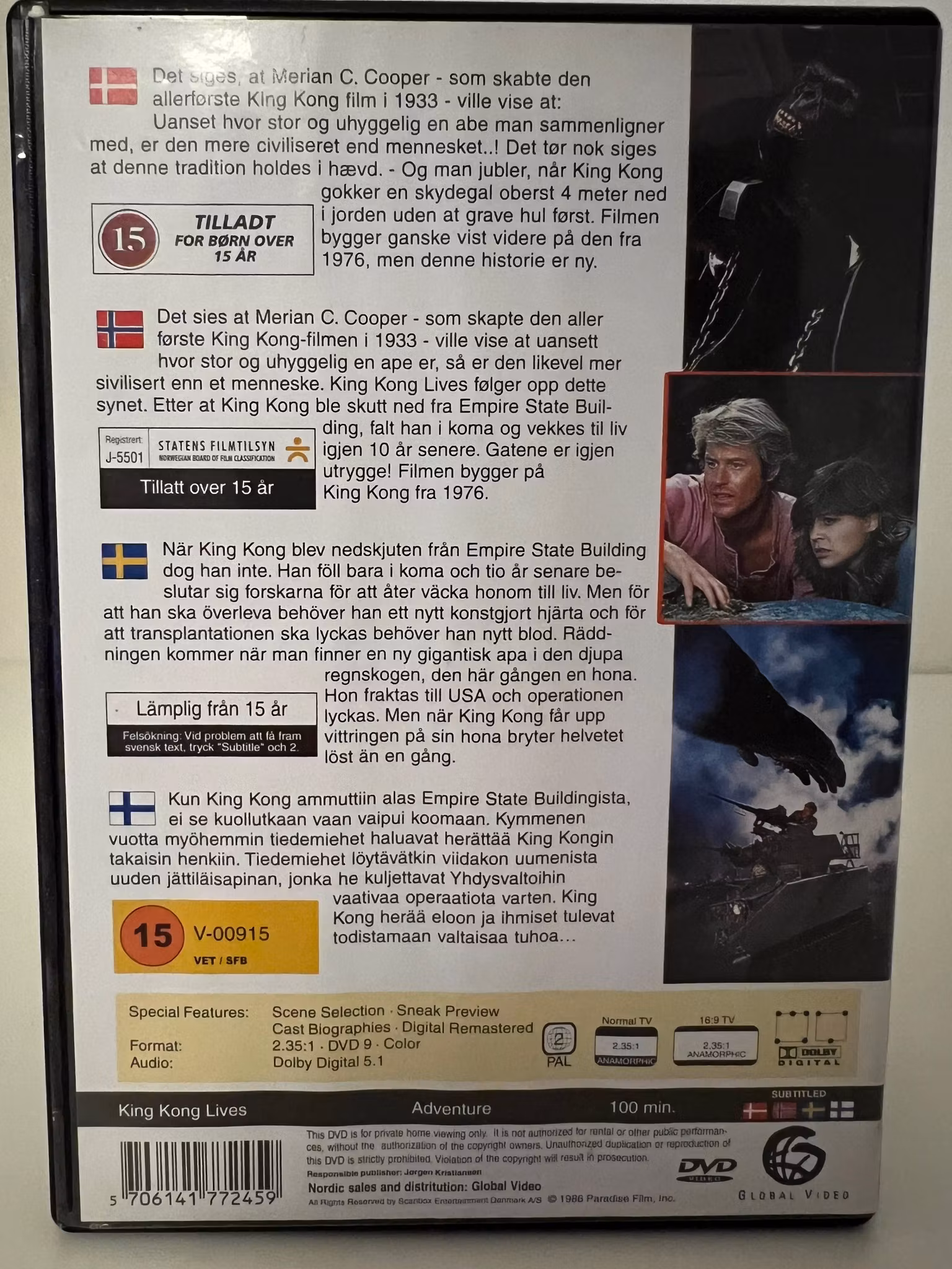Operationen lyckas, men när King Kong får upp vittringen på sin hona bryter helvetet löst än en gång. King Kong Lives är den spännande uppföljaren till 1976 års succéfilm, fylld av action och storslagna effekter. I huvudrollen ser vi Linda Hamilton, känd från Terminator-filmerna.