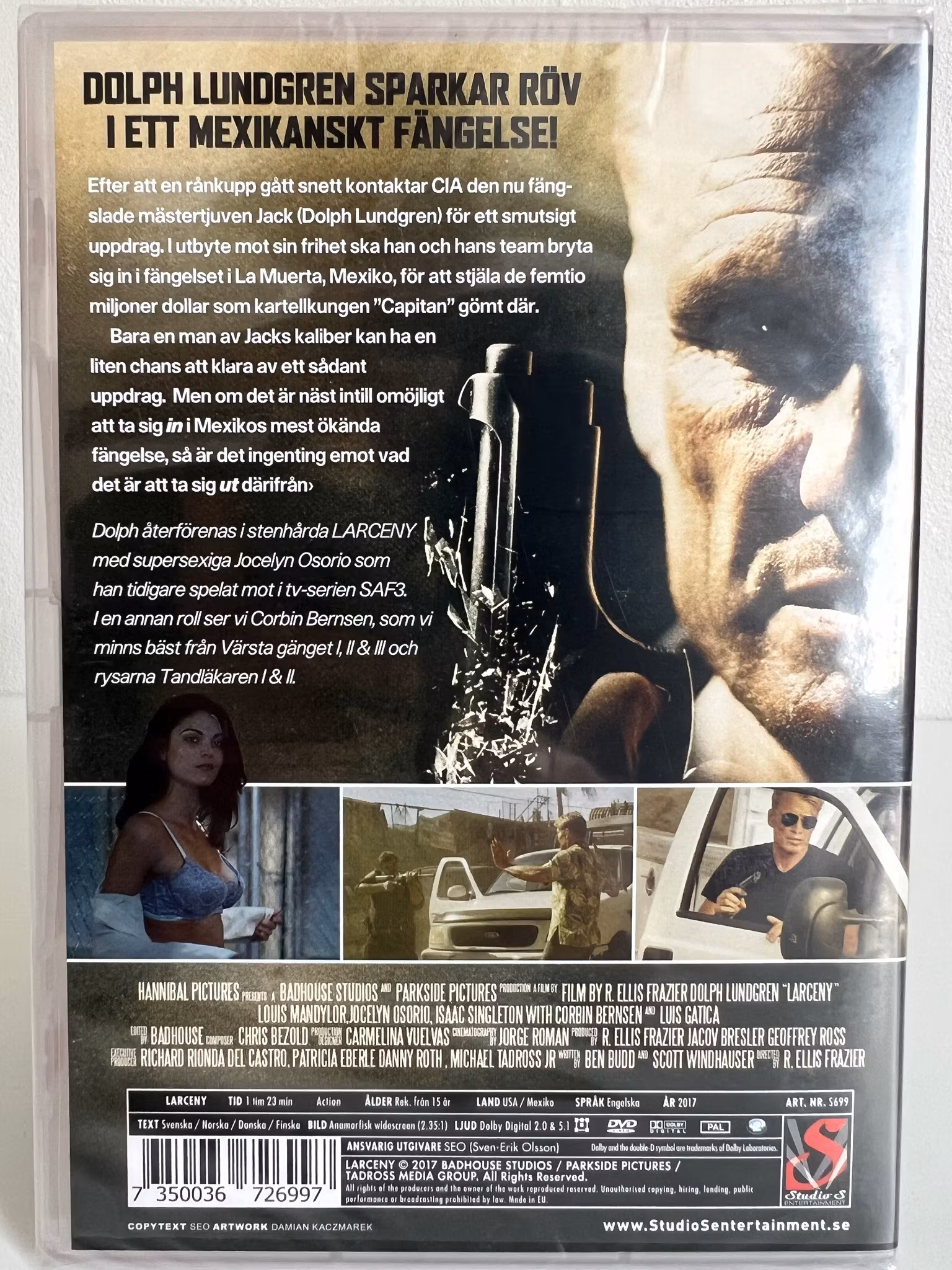 Dolph återförenas i stenhårda LARCENY med Jocelyn Osorio, som han tidigare spelat mot i tv-serien SAF3. I en annan roll ser vi Corbin Bernsen, känd från Värsta gänget-filmerna och rysarna Tandläkaren I & II.