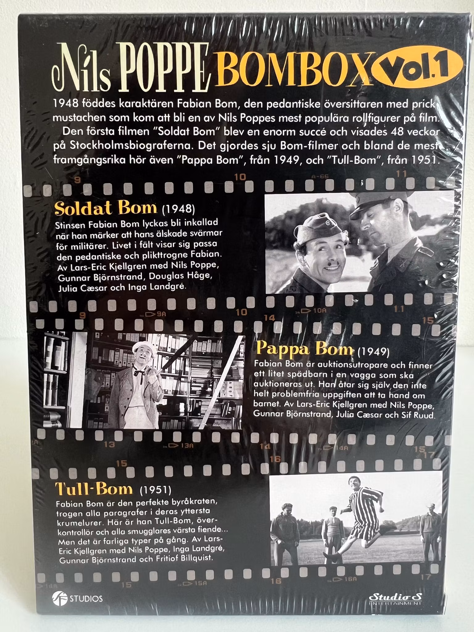 År 1948 föddes karaktären Fabian Bom och blev snabbt en av svensk films mest älskade figurer. Den första filmen, Soldat Bom, blev en makalös succé och visades hela 48 veckor i sträck på Stockholmsbiograferna. Denna box samlar de tre första och mest framgångsrika filmerna i serien.