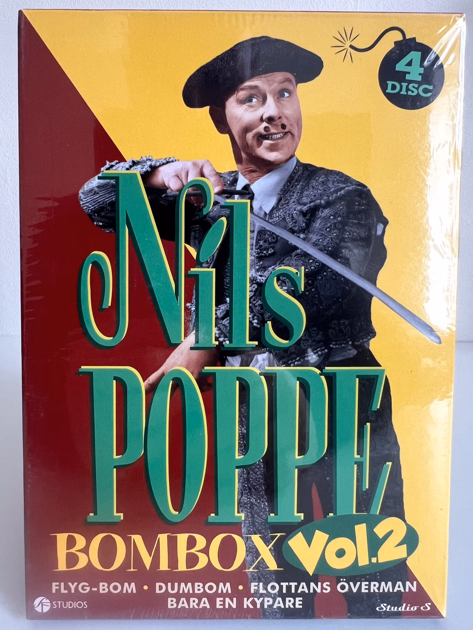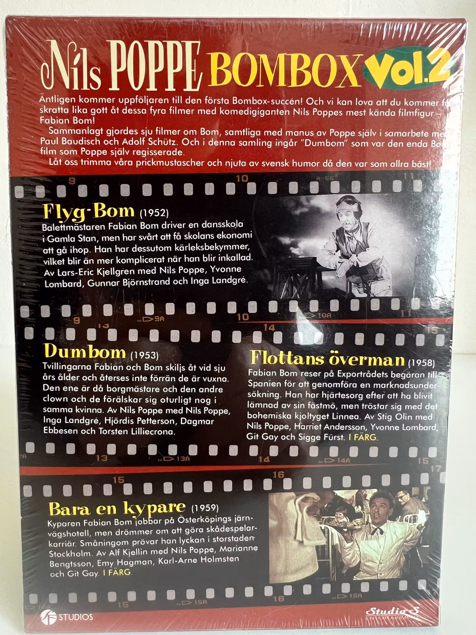 Vi kan lova att du kommer få skratta lika gott åt dessa fyra filmer med komedigiganten Nils Poppes mest kända filmfigur – Fabian Bom! Sammanlagt gjordes sju filmer om Bom, samtliga med manus av Poppe själv. I denna samling ingår bland annat "Dumbom", som var den enda Bom-film som Poppe själv regisserade.