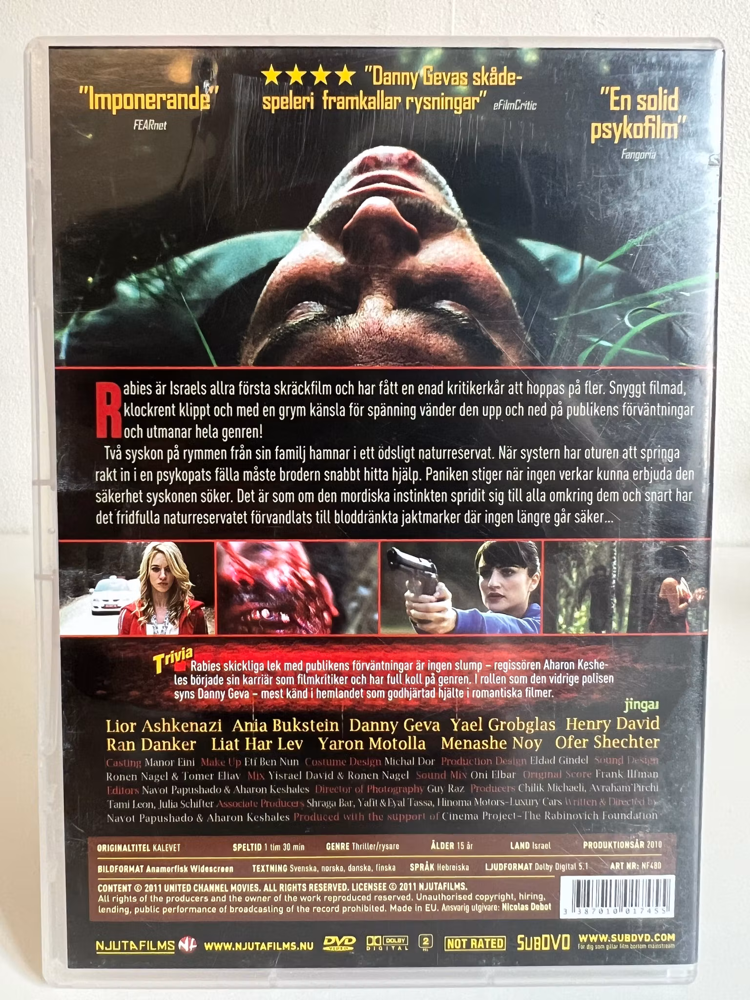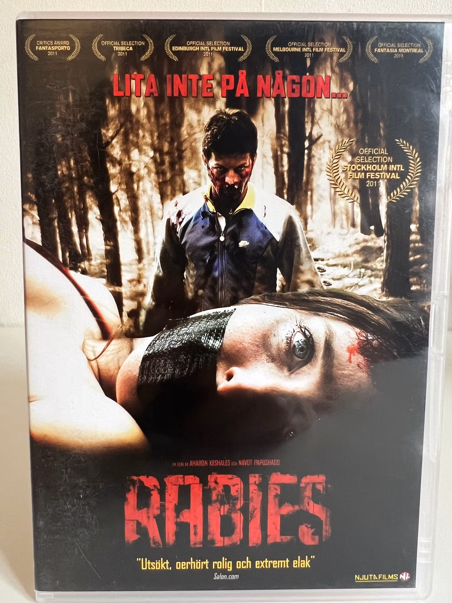 Det Àr som om den mordiska instinkten spridit sig till alla omkring dem och snart har det fridfulla naturreservatet förvandlats till bloddrÀnkta jaktmarker dÀr ingen lÀngre gÄr sÀker... Rabies utmanar hela genren med en grym kÀnsla för spÀnning och har fÄtt en enad kritikerkÄr att hoppas pÄ fler israeliska skrÀckfilmer.