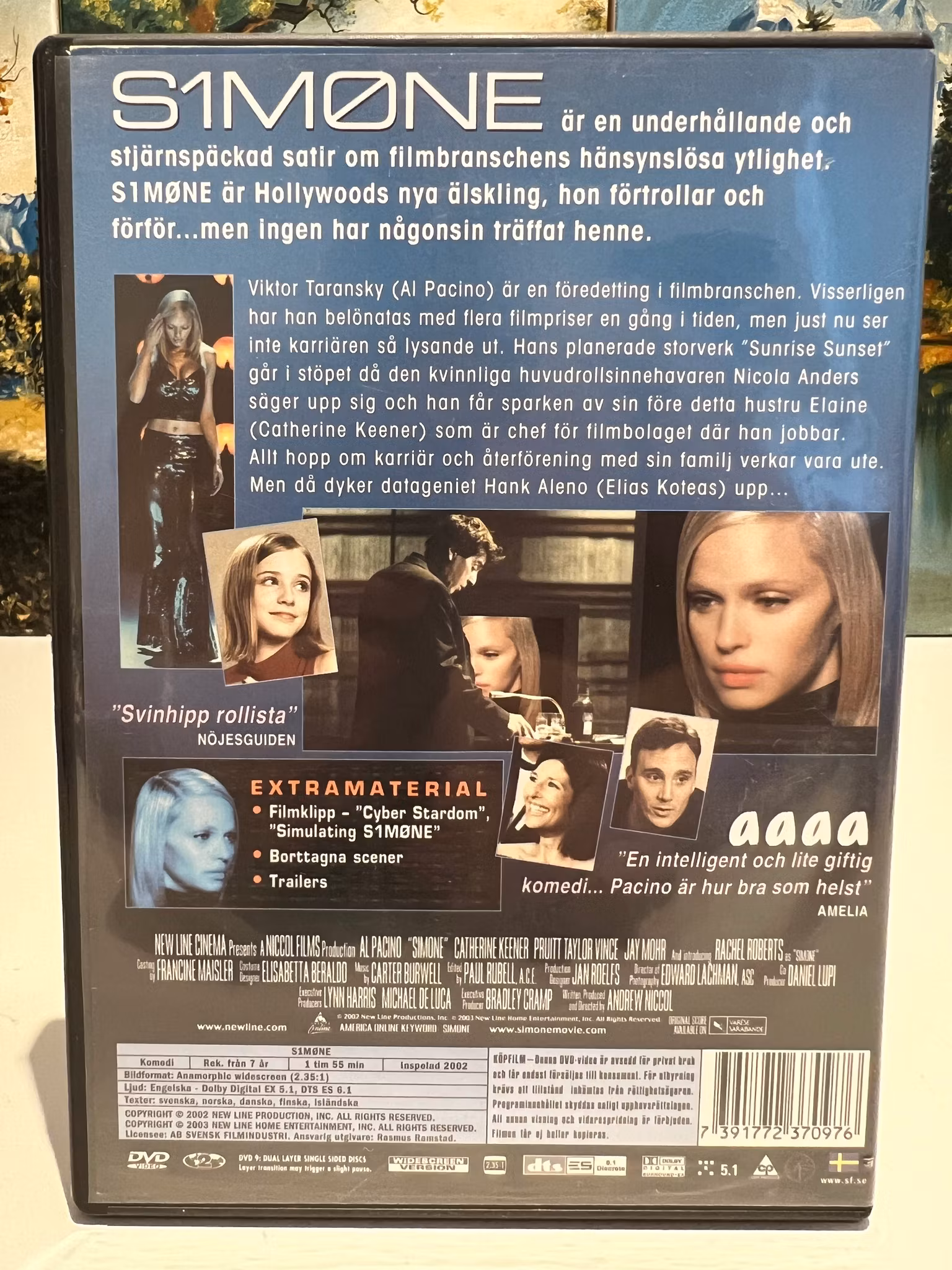Viktor Taransky (Al Pacino) Ă€r en föredetting i filmbranschen vars planerade storverk âSunrise Sunsetâ gĂ„r i stöpet nĂ€r den kvinnliga huvudrollsinnehavaren hoppar av. Allt hopp om karriĂ€r och Ă„terförening med sin familj verkar vara ute. Men dĂ„ dyker datageniet Hank Aleno upp med en lösning: Simone. S1m0ne Ă€r Hollywoods nya Ă€lskling som förtrollar och förför alla, men det finns ett problem â ingen har nĂ„gonsin trĂ€ffat henne i verkligheten.