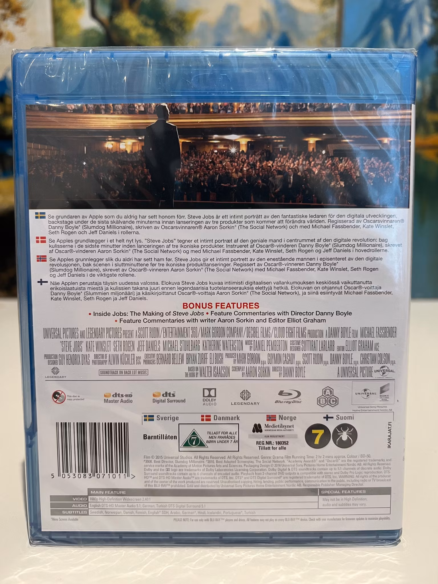 GÄ djupare med extramaterialet:Denna Blu-ray innehÄller intressant bonusmaterial för den som vill veta mer om produktionen. Du fÄr bland annat ta del av dokumentÀren "Inside Jobs: The Making of Steve Jobs" och lyssna pÄ ingÄende kommentarspÄr med bÄde regissören Danny Boyle samt manusförfattaren Aaron Sorkin och klipparen Elliot Graham.