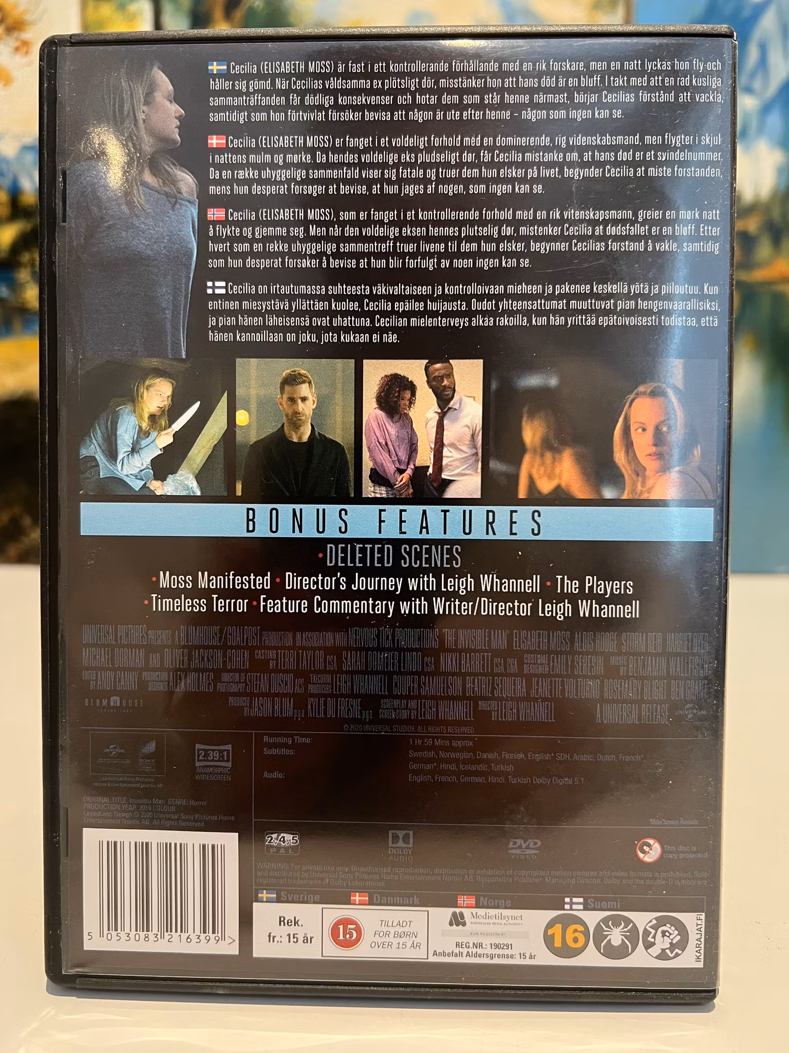 I takt med att en rad kusliga sammantrÀffanden fÄr dödliga konsekvenser och hotar dem som stÄr henne nÀrmast, börjar Cecilias förstÄnd att vackla. Hon försöker förtvivlat bevisa att hon Àr förföljd av nÄgon som ingen annan kan se. Filmen Àr en modern tolkning av den klassiska berÀttelsen, producerad av Blumhouse, och bjuder pÄ intensiv spÀnning frÄn början till slut. Denna utgÄva innehÄller Àven extramaterial som borttagna scener och kommentarer frÄn regissören Leigh Whannell.