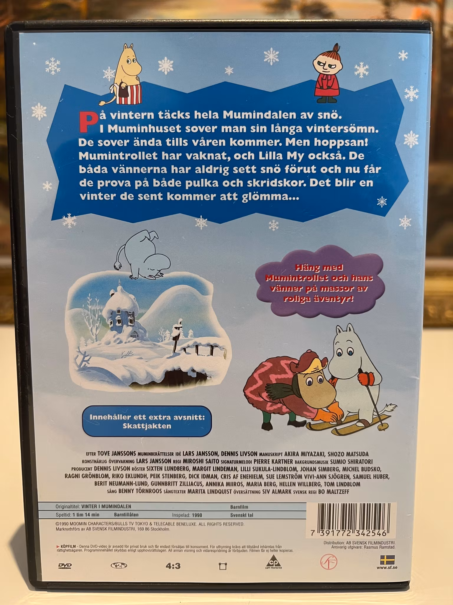 Plötsligt täcks Mumindalen av snö, vilket är en helt ny upplevelse för de vakna vännerna. De har aldrig sett snö förut och är nu redo att prova på vinterns glädjeämnen. De ger sig ut på pulka och skridskor i det vackra vinterlandskapet. Denna utgåva innehåller ett extra, spännande avsnitt: Skattjakten. Häng med Mumintrollet och hans vänner på massor av roliga och oförglömliga äventyr i Muminhuset!