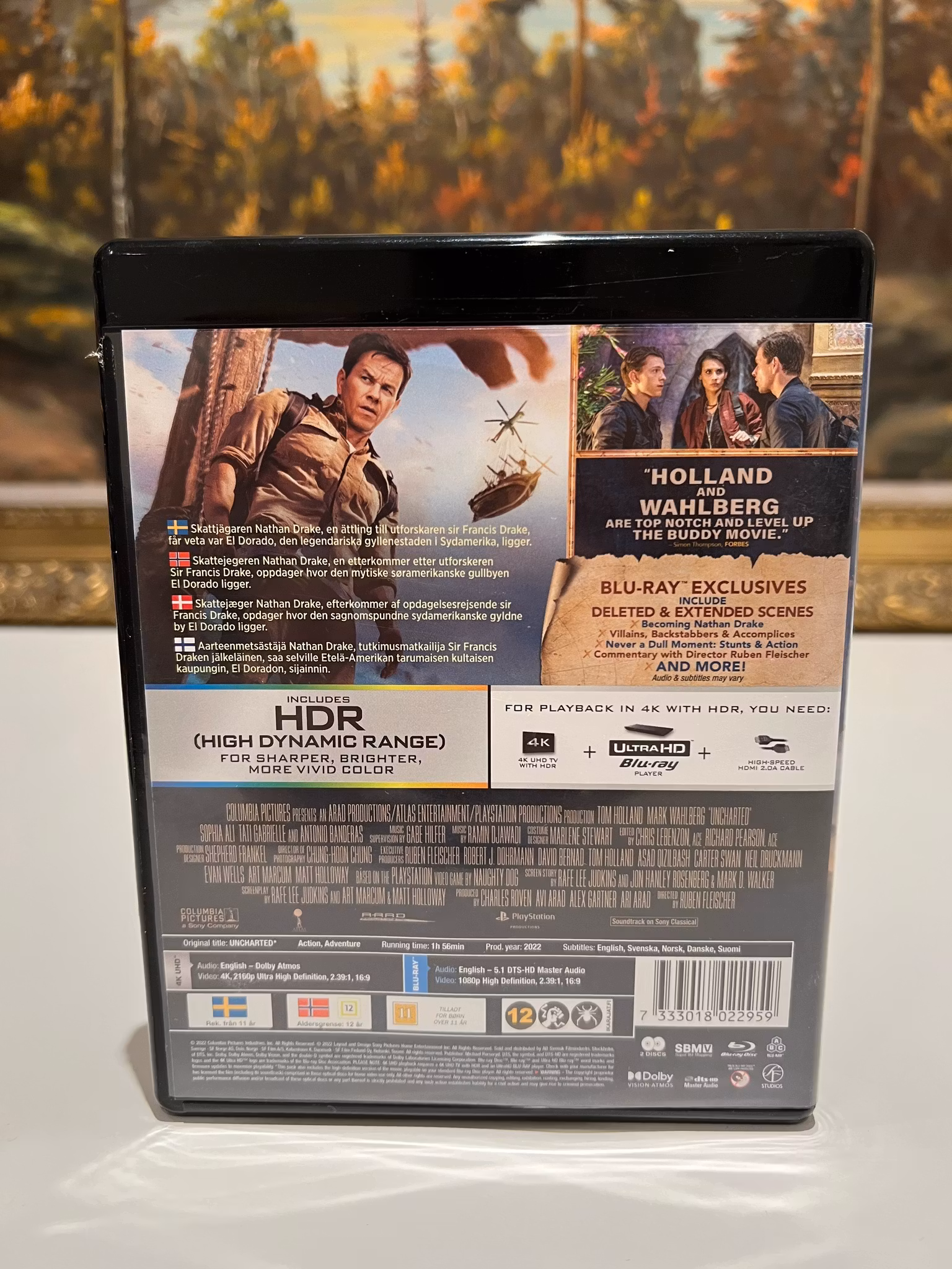 Den explosiva och visuellt imponerande filmatiseringen av PlayStation-succén! Nathan Drake (Tom Holland) rekryteras av den erfarne skattjÀgaren Victor Sullivan (Mark Wahlberg) i en dramatisk jakt pÄ den mytomspunna skatten frÄn Magellans expedition. Ett fartfyllt Àventyr fyllt med action och pussel.