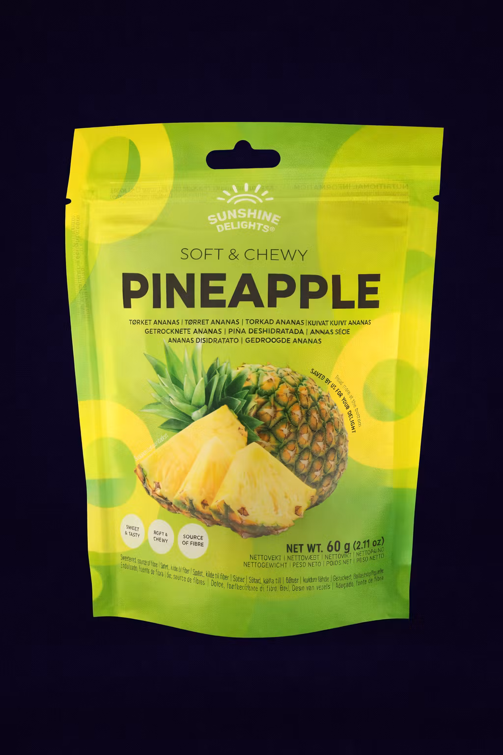 Ta med smaklökarna på en tropisk semester med Sunshine Delights Soft & Chewy Torkad Ananas! Här får du ananasbitar av högsta kvalitet, skördade i precis rätt tid för att bevara den naturliga sötman och den där härligt mjuka och sega konsistensen som man älskar.